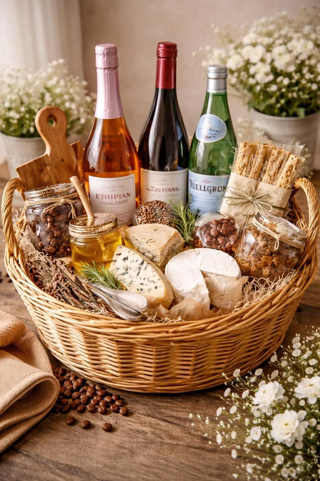 An artisanal cheese selection wrapped in wax paper or presented in small paper-wrapped rounds adds texture and sophistication to the basket immediately. A soft brie, a sharp aged cheddar, and a blue cheese cover most preferences and look stunning arranged together.
